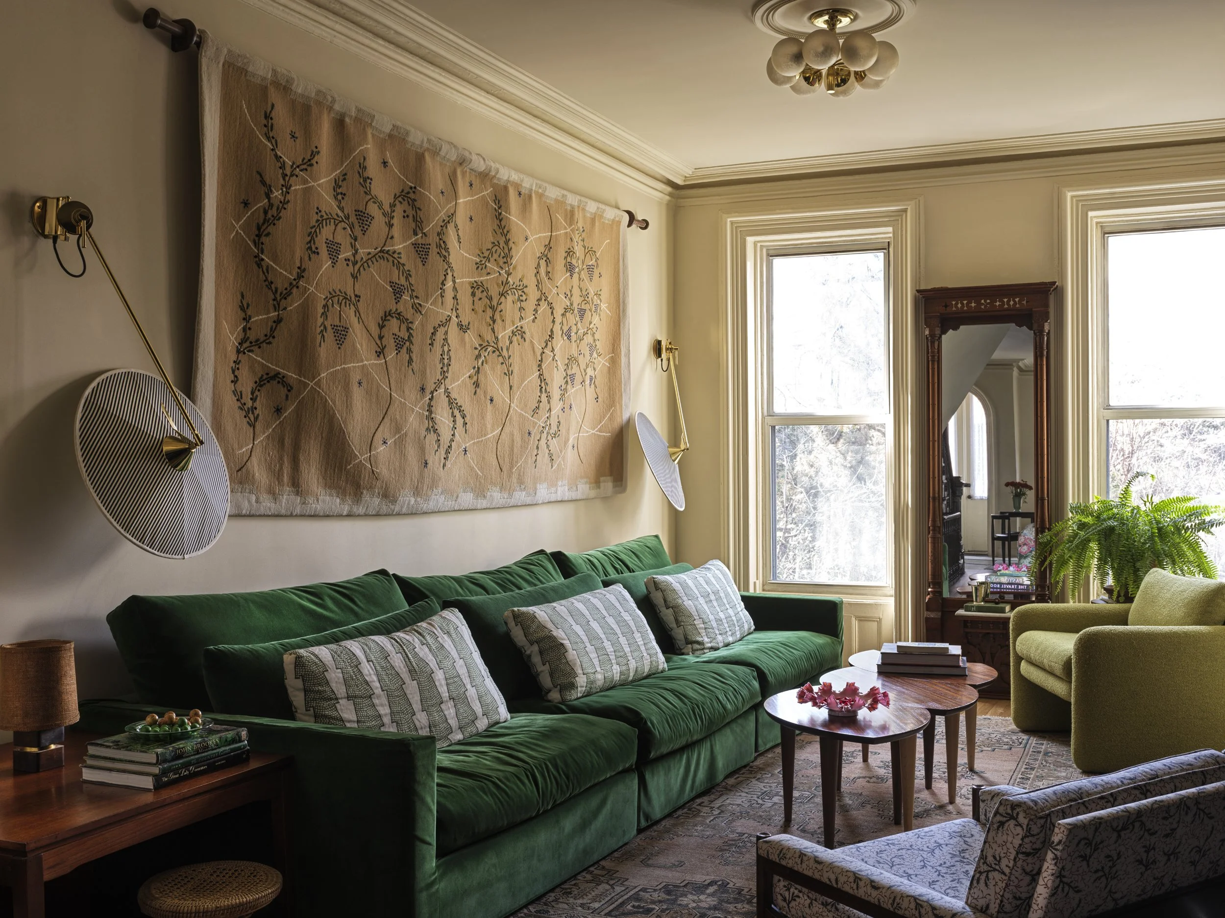 One floor up on the parlor level, the home’s insignificant width makes creating fully separate areas a challenge, so we add a massive bookcase that runs the full length of the room to serve as a backdrop for 3 separate vignettes. In the formal living area, a custom sofa is covered in an emerald velvet, and we layer in vintage lighting and seating in intentionally clashing patterns, time periods and colors to give the sense of something that has been lovingly created over the years. In the remaining spaces upstairs, we deftly weave in a variety of patterned wallpaper to honor the original ones by Fox and employ a mix of colors to make the home just-cacophonous-enough. A bank of cabinetry is added to the petite main bedroom, and its sleeping alcove is covered in Colette Cosentino’s Brindille Wallpaper whose movement mirrors the vintage Henredon headboard.